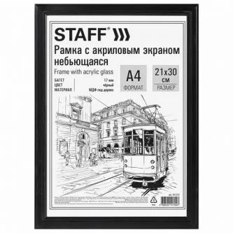 Рамка 21х30 см черная, пластик, багет 8 мм, BRAUBERG "Slim", плотный задник с ножкой, акриловый экран, 391317
