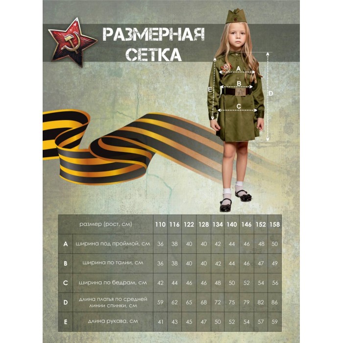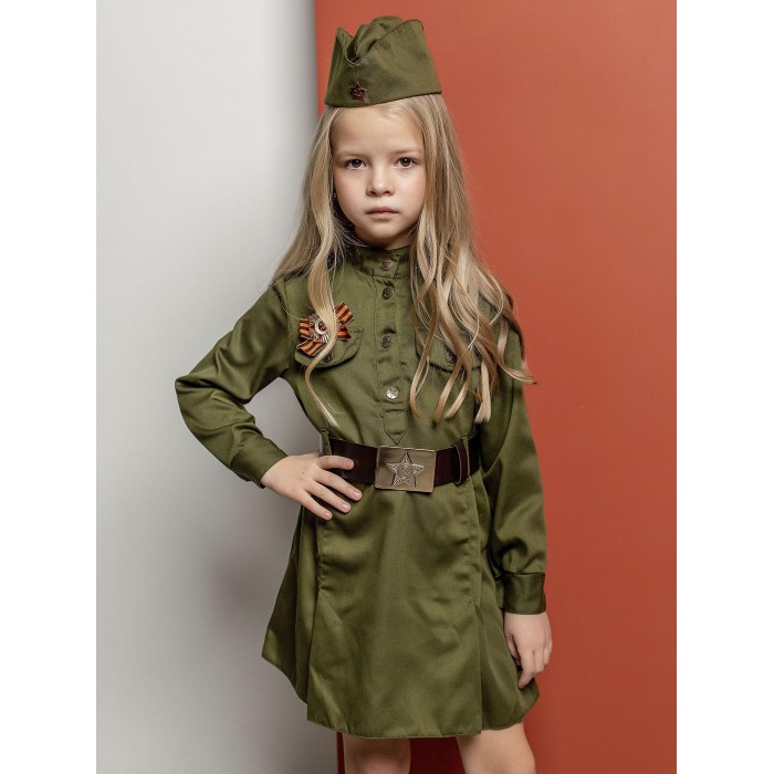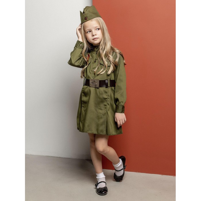 Костюм Солдатка создан для девочек, которые ни в чем не хотят отставать от мальчиков. В таком образе можно трогательно поздравить ветеранов на 9 мая, устроить представление для папы или дедушки на 23 февраля, поучаствовать в спектакле на военную тему. В комплект образа входит платье, пилотка, ремень, георгиевская лента.