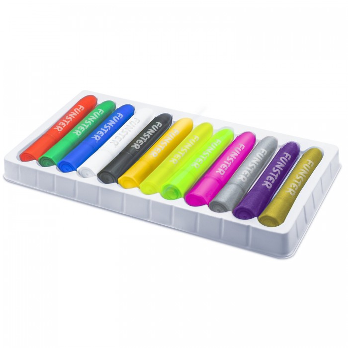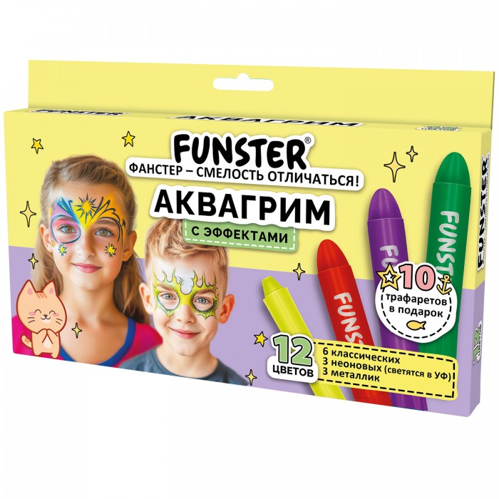 Аквагрим для лица и тела, 12 цветов (6 классических+3 неон+3 метал), 10 трафаретов, FUNSTER, 192575