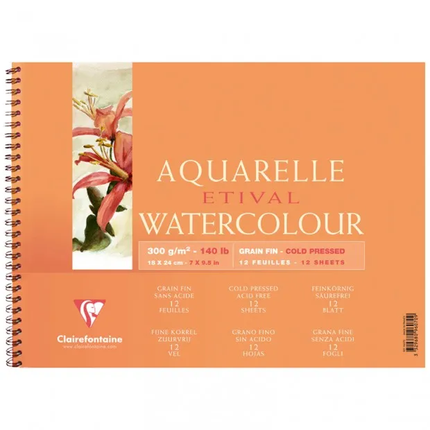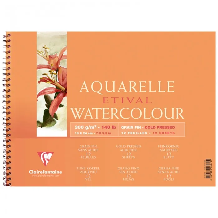 Альбом для акварели, 12л., 180*240мм на гребне Clairefontaine "Etival", 300 г/м2, холодное прессование