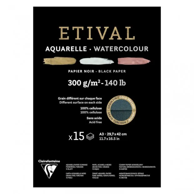 Альбом для акварели Clairefontaine «Etival» на склейке. Плотность блока: 300 г/кв.м. Размер: 297*420 мм. Имеет двустороннюю текстуру внутреннего блока: торшон/мелкое зерно. Материал обложки: картон. Альбом для акварели Etival – это уникальная 100% целлюлозная чёрная бумага, которая сохраняет свойства хлопковой бумаги. Идеально подходит для работ акварелью интерферентных, иридисцентных цветов и цветов металлик. Также хорошо взаимодействует с гуашью и тушью.