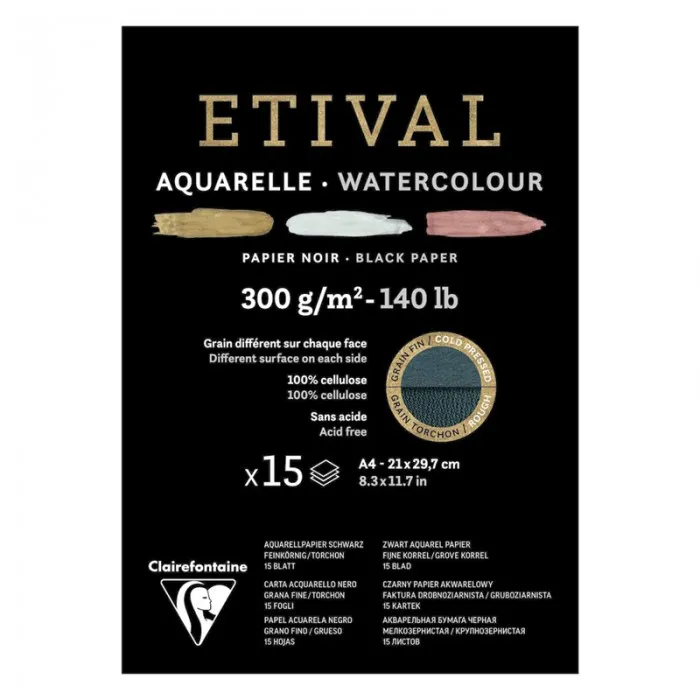 Альбом для акварели Clairefontaine «Etival» на склейке. Плотность блока: 300 г/кв.м. Размер: 210*297 мм. Имеет двустороннюю текстуру внутреннего блока: торшон/мелкое зерно. Материал обложки: картон. Альбом для акварели Etival – это уникальная 100% целлюлозная чёрная бумага, которая сохраняет свойства хлопковой бумаги. Идеально подходит для работ акварелью интерферентных, иридисцентных цветов и цветов металлик. Также хорошо взаимодействует с гуашью и тушью.