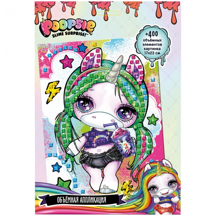 Аппликация объемная POOPSIE - чудесный подарок для поклонницы единорогов. Девочка сама, с помощью объемных элементов, сможет создать невероятно красивую, сверкающую картинку с любимыми персонажами. Занимаясь аппликацией, ребенок учится сочетать цвета, формируется чувство вкуса. Это отличная тренировка самоконтроля, усидчивости, внимательности. Активизируется мышление, развивается мелкая моторика. В наборе: - картинка (17х23 см), - больше 400 цветных объемных клеящихся элементов, покрытых глиттером. Как создать картину: 1. Выберите квадратик определенного цвета. 2. Открепите его и приклейте на соответствующий цвет и номер на картинке. 3. Следуйте схеме, и получится красивая картинка. 4. Оставшиеся квадратики приклейте на свободные места на картинке. Итак, сверкающая, оригинальная картина готова! Аппликация помогает ребенку максимально проявить свои творческие способности. Так как в наборе много мелких деталей, дети младше 6 лет должны работать с аппликацией под присмотром взрослых.