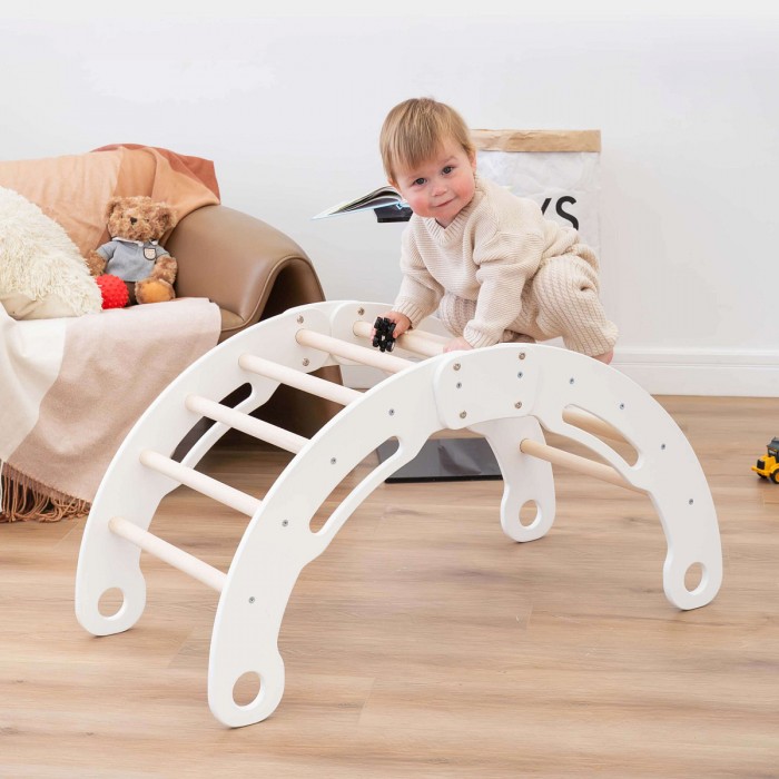 Первый способ — в качестве скалолазной дуги. Лазание развивает координацию и логическое мышление малыша, тренирует его руки и ноги, а также учит держать равновесие и планировать дальнейшие действия заранее.