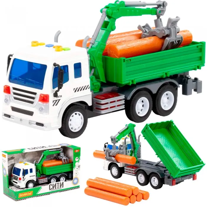 Автомобиль Сити бортовой с манипулятором инерционный со светом и звуком зеленый (в коробке) 96029