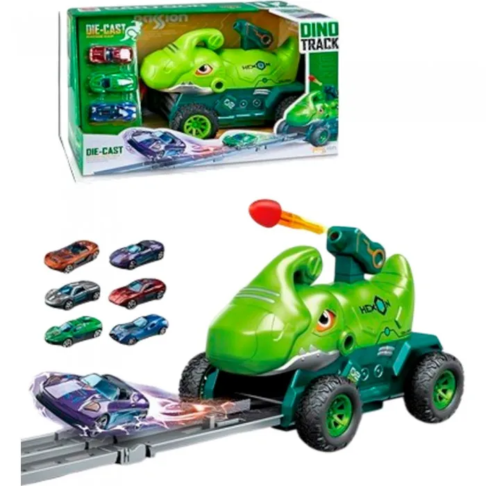 Автотрек зеленый Динозавр с набором машин в коробке