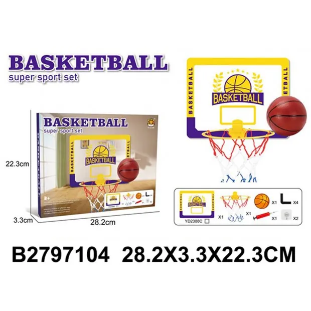 Размер упаковки: 28,2 х 3,3 х 22,3 см Функционал: спортивная игра Упаковка: картонная коробка Страна обладатель бренда: КНР Материал: пластик, нейлон Комплектация: сетка - 1 шт., кольцо - 1 шт., доска - 1 шт., мяч - 1 шт., крепление - 2 шт., скоба - 4 шт., насос - 1 шт. Возраст ребенка: от 3 лет Баскетбол — активная и подвижная спортивная игра, которая поможет интересно и с пользой для физического развития провести время. Набор для баскетбола понравится детям и подойдет для начинающих юных игроков. Особенности: - сборная подвесная конструкция; - яркие цвета; - прочные материалы; - можно установить как дома, так и на улице, например, на даче — для игр на свежем воздухе; - корзина устанавливается в соответствии с ростом ребенка; - доску с корзиной можно прикрепить саморезами с стене или столбу. Баскетбол развивает: - выносливость; - скорость реакции; - меткость в бросании мяча; - соревновательный дух.