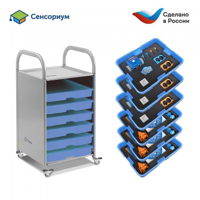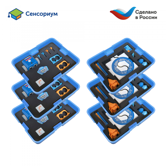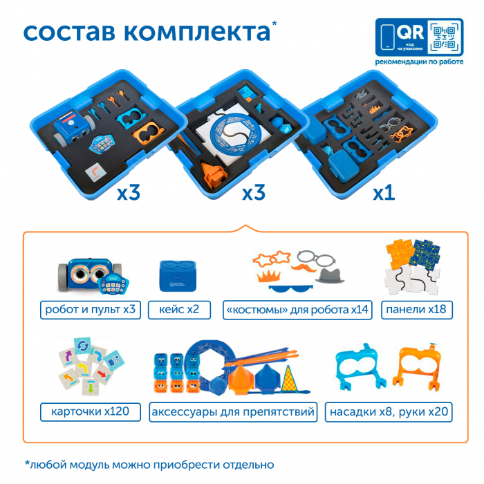 - 81 аксессуар для создания препятствий на пути робота: 24 палочек, 36 кубов, 6 конусов, 6 флажков, 6 мячей и ворота.