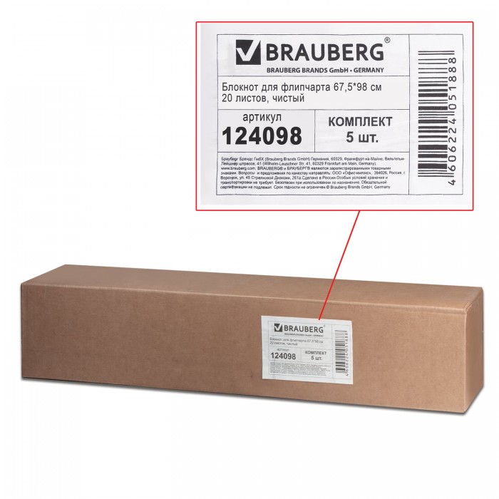 Блокноты для флипчарта ПЛОТНЫЕ 80 г/м2, BRAUBERG, 67,5х98 см, КОМПЛЕКТ 5 шт., 20 л., чистые, 124098