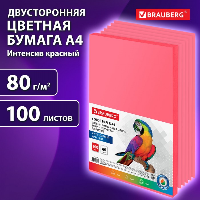 Бумага цветная BRAUBERG, А4, 80 г/м2, 100 л., интенсив, красная, для офисной техники, 112449