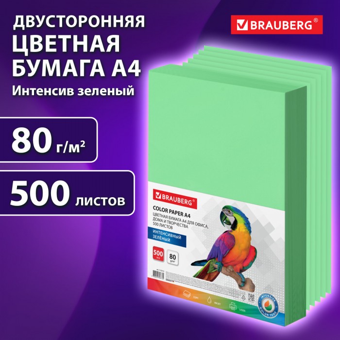 Бумага цветная BRAUBERG, А4, 80 г/м2, 500 л., интенсив, зеленая, для офисной техники, 115213