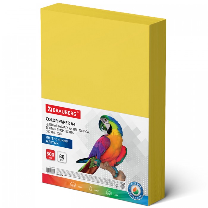 Бумага цветная BRAUBERG, А4, 80 г/м2, 500 л., интенсив, желтая, для офисной техники, 115216