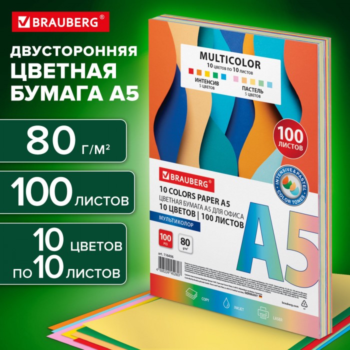 Бумага цветная МАЛОГО ФОРМАТА 10 цветов, BRAUBERG MULTICOLOR А5, 80 г/м2, 100 л., (10 цветов x 10 листов), 116406