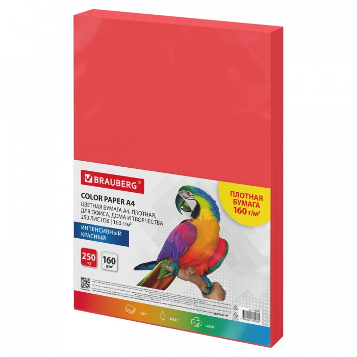 Бумага цветная ПЛОТНАЯ BRAUBERG, А4, 160г/м2, 250л, красная, интенсив, для печати, творчества, 116672
