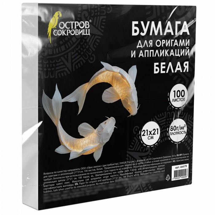 Бумага для оригами и аппликаций 21*21 см, 100 листов, белая, ОСТРОВ СОКРОВИЩ, 666175