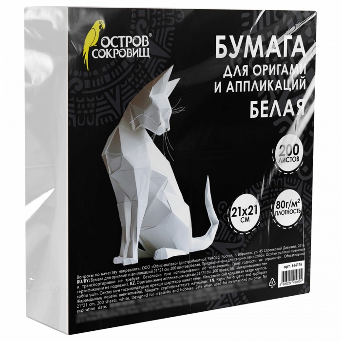 Бумага для оригами и аппликаций 21*21 см, 200 листов, белая, ОСТРОВ СОКРОВИЩ, 666176