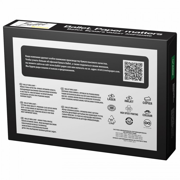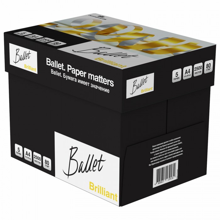 Бумага офисная А4, 80 г/м2, 500 л., марка А, BALLET BRILLIANT, Россия, 165% (CIE)
