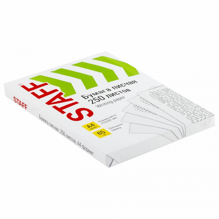 Бумага писчая А4, 65 г/м2, 250 л., Россия, белизна 92% (ISO), STAFF, 114214