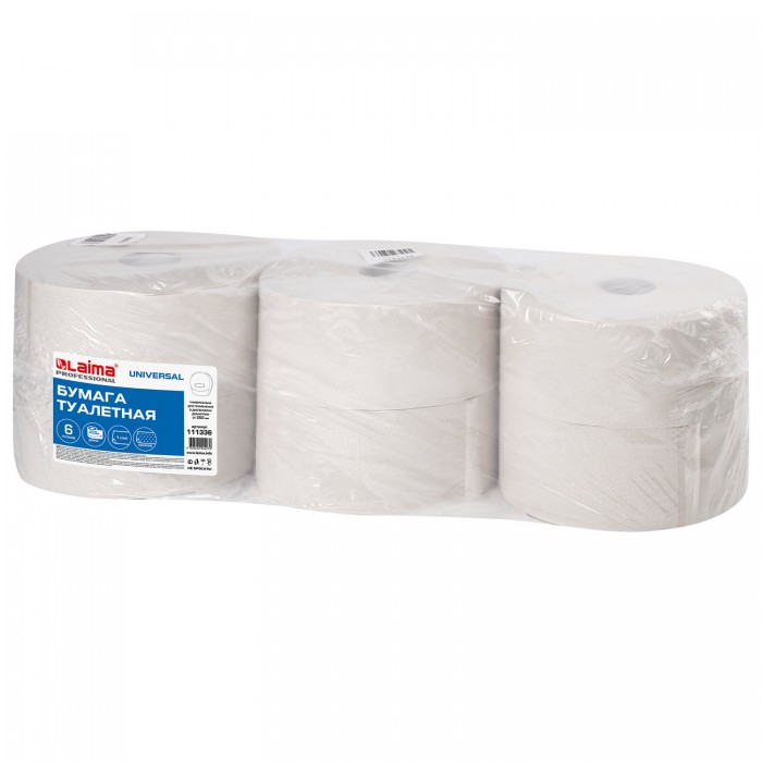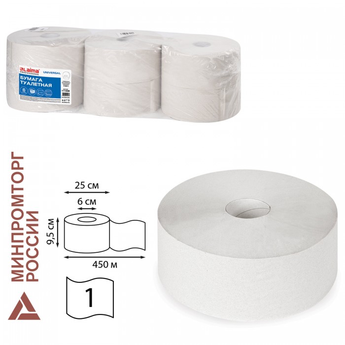 Бумага туалетная БОЛЬШОЙ РУЛОН, 450 м, LAIMA (T1), UNIVERSAL, 1-слойная, КОМПЛЕКТ 6 рулонов, 111336