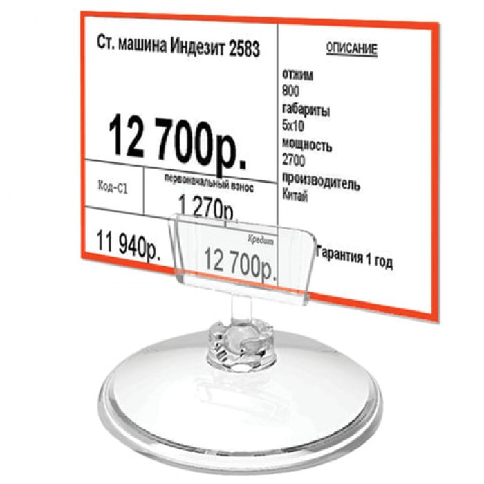 Ценникодержатель на прозрачной пластиковой подставке. Шарнирное соединение позволяет регулировать угол наклона.