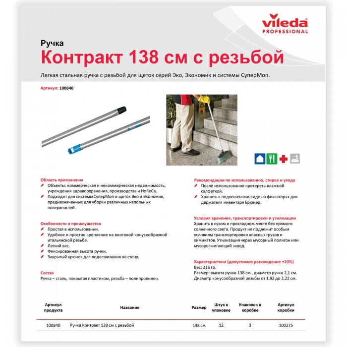 В интернет-магазине AV Group можно купить Черенок рукоятка для уборочного инвентаря 138 см, еврорезьба, металлопластик, VILEDA "Контракт", 100840, производитель Испания, артикул 100840 по цене 751 руб. Продаем физическим и юридическим лицам, при условии минимальной суммы заказа (общей суммы в корзине) от 5 тысяч рублей. Возможна доставка курьером по Верхней Пышме, Екатеринбургу и Свердловской области. В регионы отправляем транспортной компанией. Чтобы уточнить необходимое количество товара и дополнительные условия, звоните: 8(800)201-75-47, менеджер вас проконсультирует.