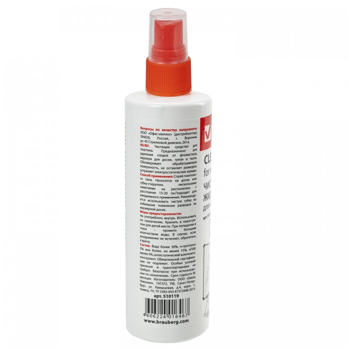 Чистящая жидкость-спрей BRAUBERG предназначена для очистки поверхности маркерных досок.