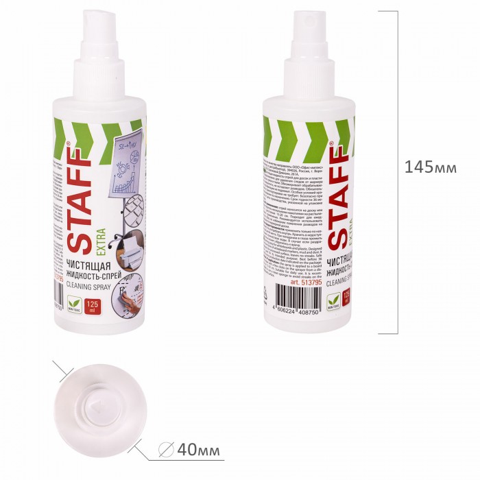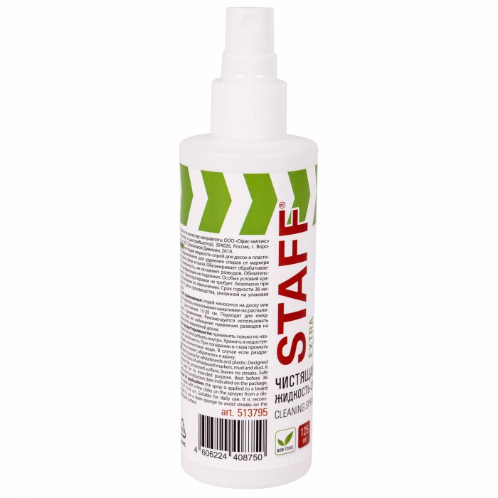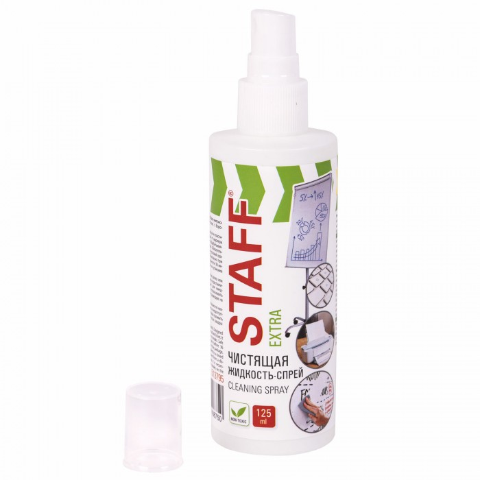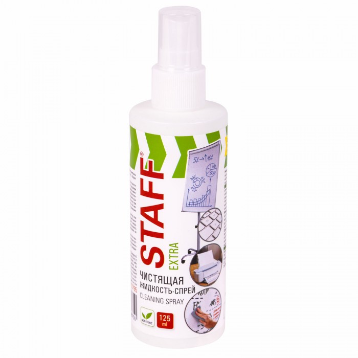 Чистящая жидкость-спрей STAFF Extra предназначена для удаления надписей и загрязнений с маркерных досок и пластиковых поверхностей.