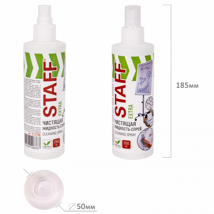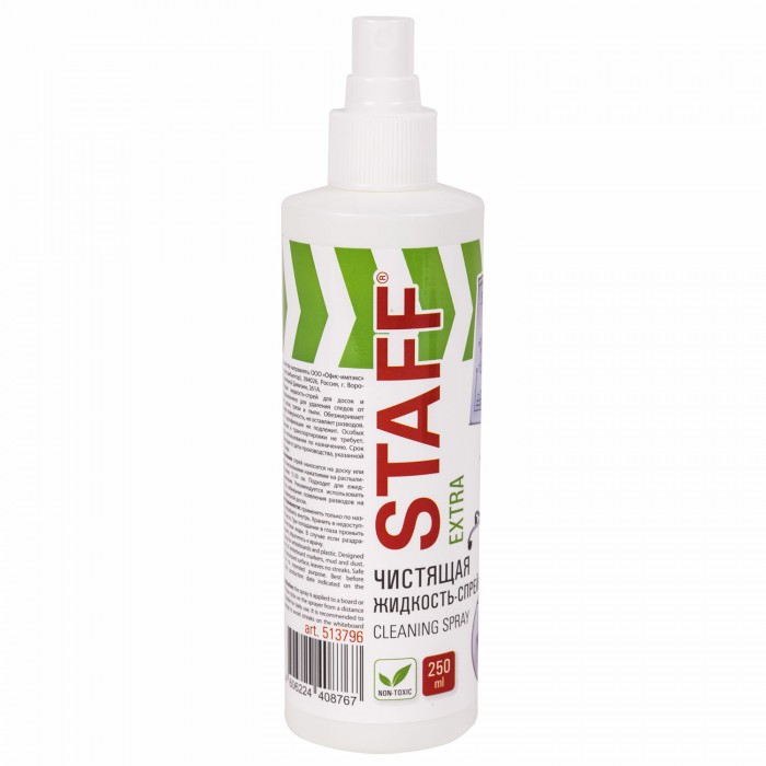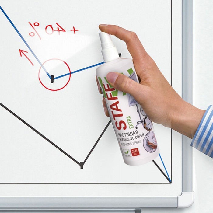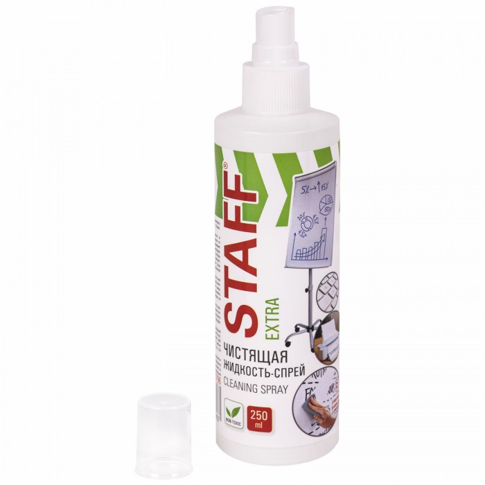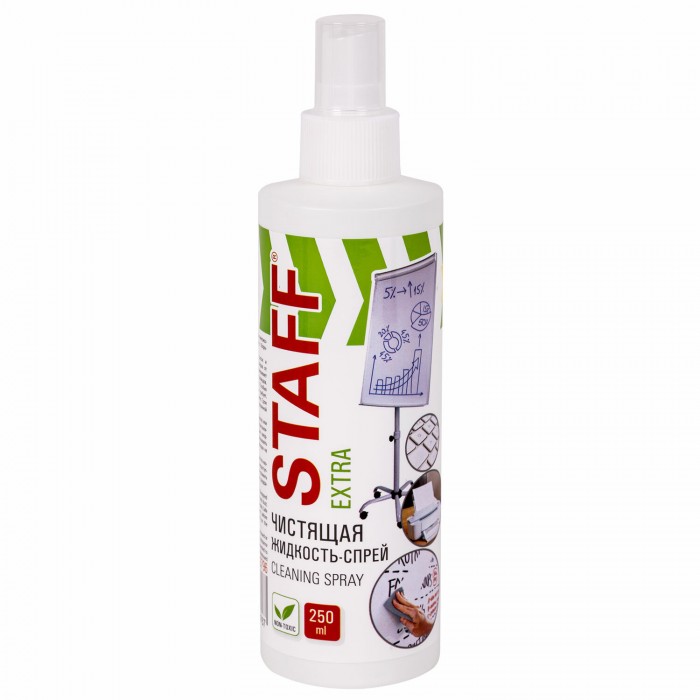 Чистящая жидкость-спрей STAFF Extra предназначена для удаления надписей и загрязнений с маркерных досок и пластиковых поверхностей.