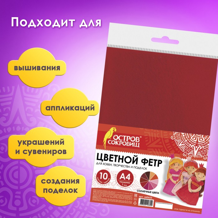 Цветной фетр ОСТРОВ СОКРОВИЩ предназначен для создания ярких творческих поделок дома, в школе и в детском саду. Используется для создания аппликаций и вышивания, легко режется и приклеивается на ровную поверхность.