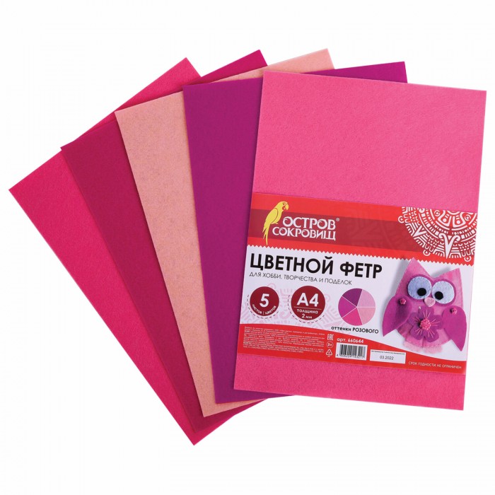 Цветной фетр МЯГКИЙ А4, 2 мм, 5 листов, 5 цветов, плотность 170 г/м2, оттенки розового, ОСТРОВ СОКРОВИЩ, 660644