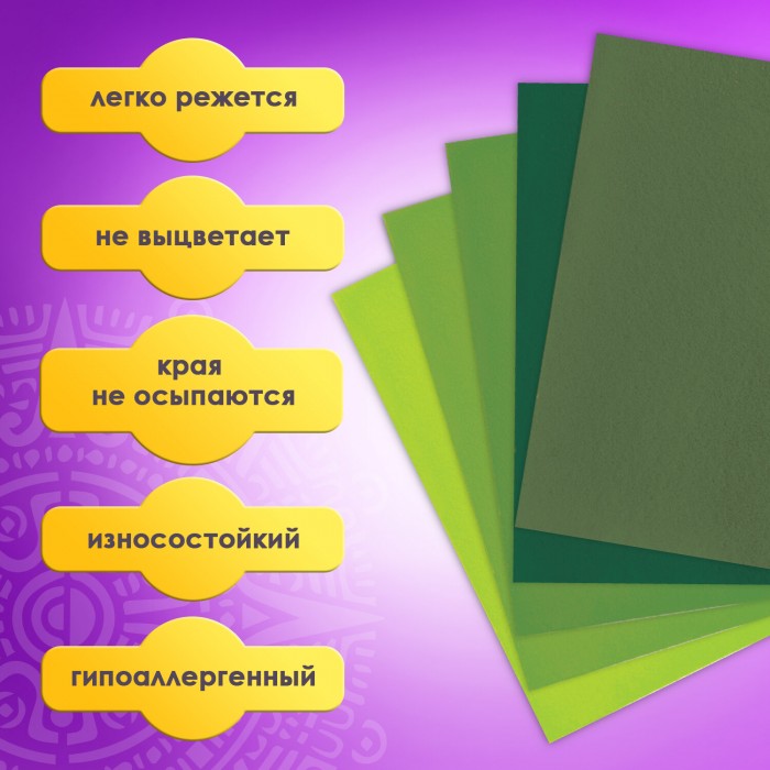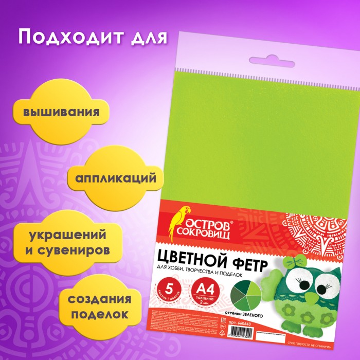 Цветной фетр МЯГКИЙ А4, 2 мм, 5 листов, 5 цветов, плотность 170 г/м2, оттенки зеленого, ОСТРОВ СОКРОВИЩ, 660643
