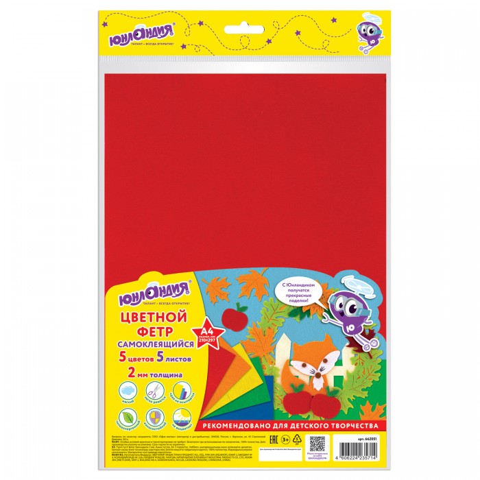Цветной фетр ЮНЛАНДИЯ предназначен для создания ярких творческих поделок дома, в школе и в детском саду. Используется для создания аппликаций и вышивания, легко режется и приклеивается на ровную поверхность.