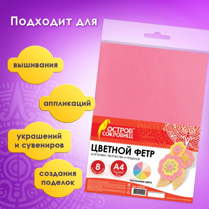 Цветной фетр ОСТРОВ СОКРОВИЩ предназначен для создания ярких творческих поделок дома, в школе и в детском саду. Используется для создания аппликаций и вышивания, легко режется и приклеивается на ровную поверхность.