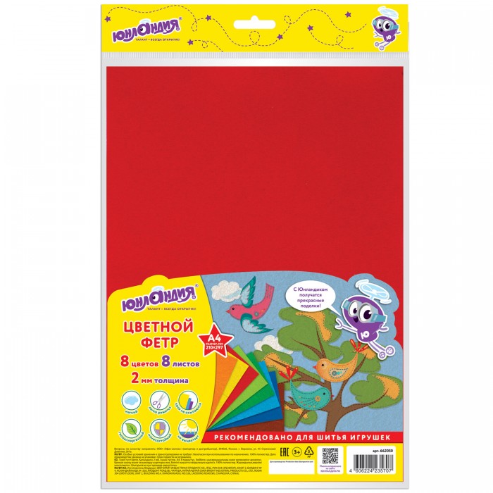 Цветной фетр ЮНЛАНДИЯ предназначен для создания ярких творческих поделок дома, в школе и в детском саду. Используется для создания аппликаций и вышивания, легко режется и приклеивается на ровную поверхность.