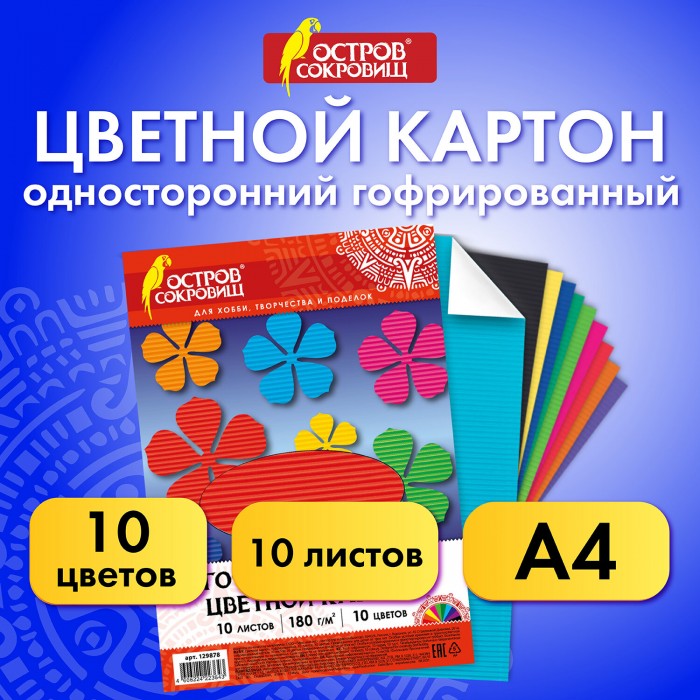 Цветной картон А4, ГОФРИРОВАННЫЙ, 10 листов, 10 цветов, 180 г/м2, ОСТРОВ СОКРОВИЩ, 129878