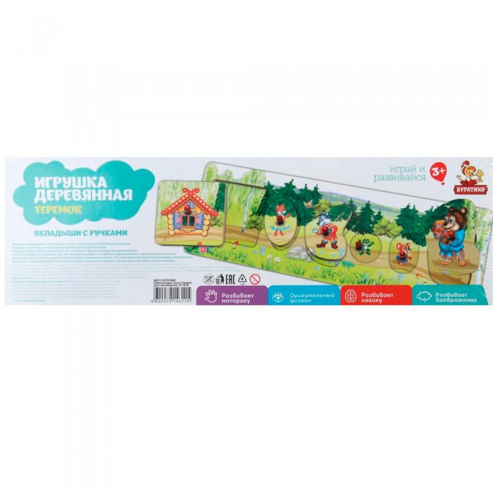 Размер упаковки: 30 х 10 х 1 см Функционал: развивающая игра, рамки и вкладыши Упаковка: термопак Страна обладатель бренда: Россия Материал: дерево, пластик Комплектация: основа - 1 шт., фигурка - 6 шт. Возраст ребенка: от 3 лет Деревянная игра состоит из основы и различных фигурных элементов, которые нужно располагать по принципу рамок и вкладышей. Особенности: - элементы логически связаны между собой; - удобные пластиковые ручки на вставках; - сказка «Теремок»; - фигурная вырубка; - яркие цвета; - чёткая печать; - натуральное дерево. Рамка вкладыш развивает у детей: - мелкую моторику; - зрительное восприятие; - ассоциативное и логическое мышление; - память; - умение сопоставлять.