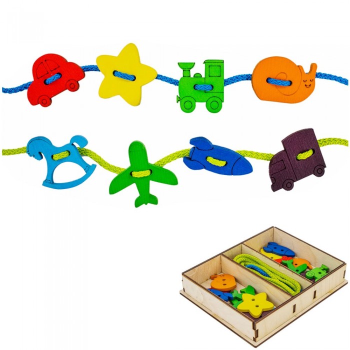Размер упаковки: 15 х 11,5 х 2,8 см Функционал: игрушки для детей Вид: деревянная шнуровка Упаковка: деревянная коробка Страна обладатель бренда: Россия Материал: древесина, текстиль Комплектация: 16 фигурок, 2 шнурка Возраст ребенка: с 3+ лет. Игра состоит из деревянных фигурок с дырочками, которые необходимо нанизывать на яркий шнурок. Это занятие подарит малышу массу положительных эмоций и позволит непоседе от 3-х лет развить мелкую моторику, внимание, логическое мышление, координацию движения рук, укрепить мускулатуру пальчиков. Придумайте интересную историю про яркие фигурки, чтобы учиться шнуровать стало ещё интереснее. Это прекрасный тренажер для освоения навыков продевания шнура в отверстие. Все детали данной игры изготовлены из экологически чистых материалов.