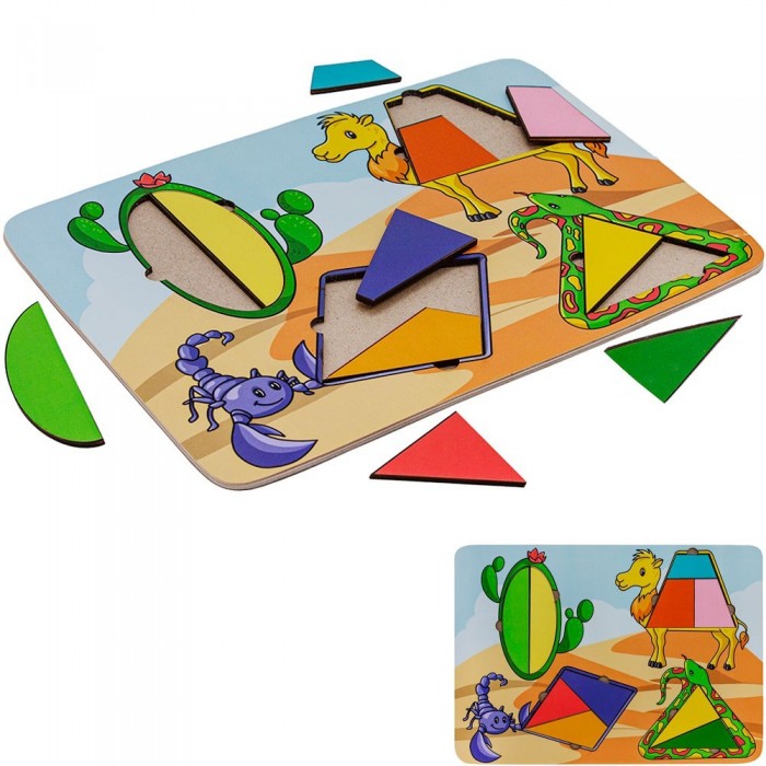 Размер упаковки: 30 х 20,3 х 0,5 см Упаковка: пленка Функционал: развивающие игрушки и игры Вид: деревянная головоломка Страна обладатель бренда: Россия Материал: древесина, самоклеящеяся бумага Комплектация: деревянная основа (30 х 20,3 х 0,2 см) – 1 шт., детали - 10 шт. Возраст ребенка: детям с 3+ лет. Игрушка состоит из деревянной основы с рамкой для вкладывания с изображениями на тему сафари (змея, верблюд, кактус, скорпион) и набора фигурных деталей-пазлов. Задача ребенка: из отдельных деталей собрать единую композицию (используя для подсказки контуры на деревянной основе). Игрушка способствует развитию у детей: - наглядно-образного мышления, - воображения, внимания, - понимания цвета, величины и формы, - восприятия, комбинаторных способностей. Сделано из экологичного материала, безопасного для детей младшего возраста.