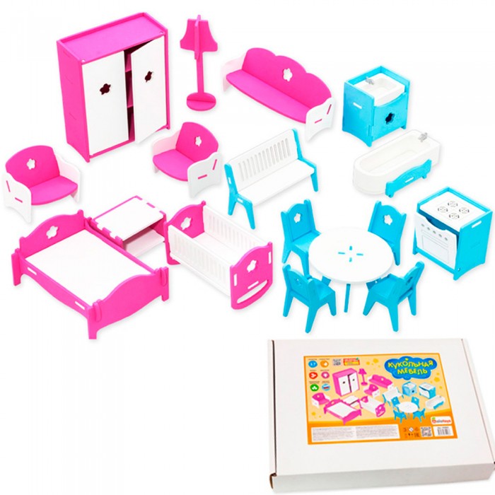 Размер упаковки: 44*13*6 см Вес: 775 г Функционал: набор кукольной мебели Упаковка: картонная коробка Страна обладатель бренда: Россия Материал: МДФ, фанера Комплектация: мебель - 17 деталей Возраст ребенка: от 3 лет Этот набор стильной и красивой мебели придется по душе маленьким любительницам кукольных домиков. Он отлично подойдет для разного рода игр, его можно использовать как самостоятельно, так и для комплектации игровых домиков для кукол. В набор входят различные предметы мебели, которые помогут с уютом обустроить жилище куклы. Мебельный гарнитур стильный, практичный. Все изделия выполнены из прочных и износостойких материалов, легких в уходе. Мебель разборная, процесс сборки не займет много времени. Мебельные наборы для разных комнат дополняют друг друга и позволяют девочке собрать и обставить свой собственный домик мечты для любимой куклы.