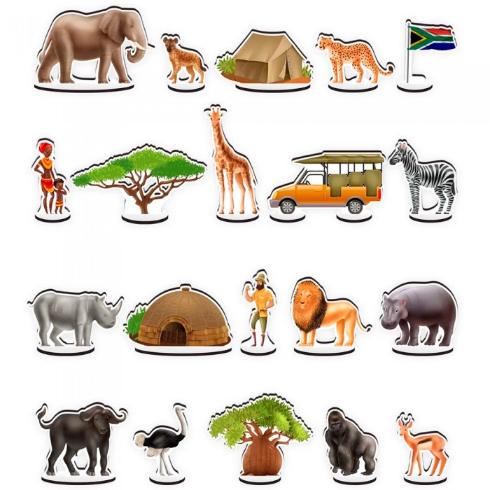 Размер упаковки: 19 х 14,5 х 4 см Вес: 270 г Функционал: настольная игра Упаковка: картонная коробка Страна обладатель бренда: Россия Материал: картон Комплектация: фигурка - 20 шт., подставка - 20 шт. Возраст ребенка: от 3 лет Развивающий игровой набор фигурок — это отличный выбор для детей, которые любят играть и учиться одновременно. В наборе представлены африканские животные, растения и предметы с тематикой сафари. Также в наборе есть деревья и другие растения, которые помогут создать реалистичный пейзаж. Красочные элементы привлекут внимание ребенка. Особенности: - двусторонняя печать; - безопасные материалы; - красочный дизайн; - сборная конструкция. Настольная игра направлена на развитие: - логического мышления; - воображения; - логики; - умения манипулировать мелкими предметами.