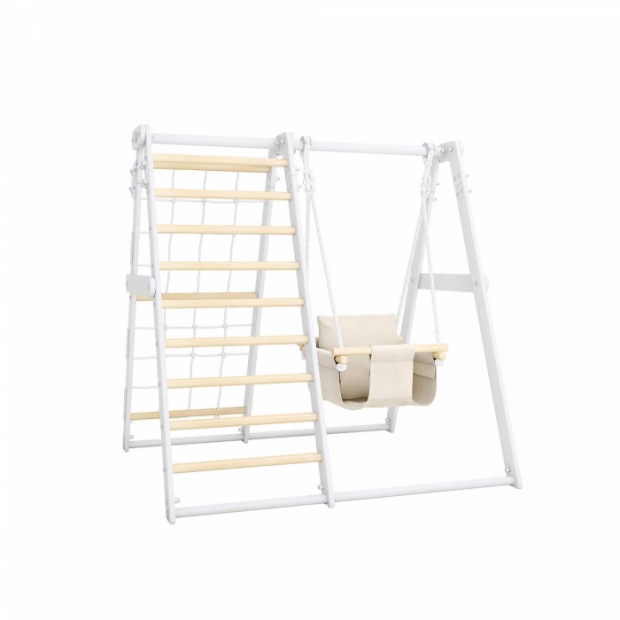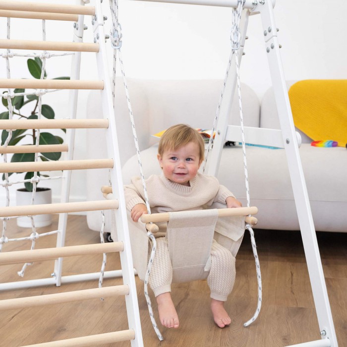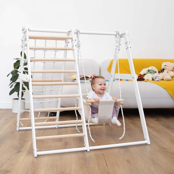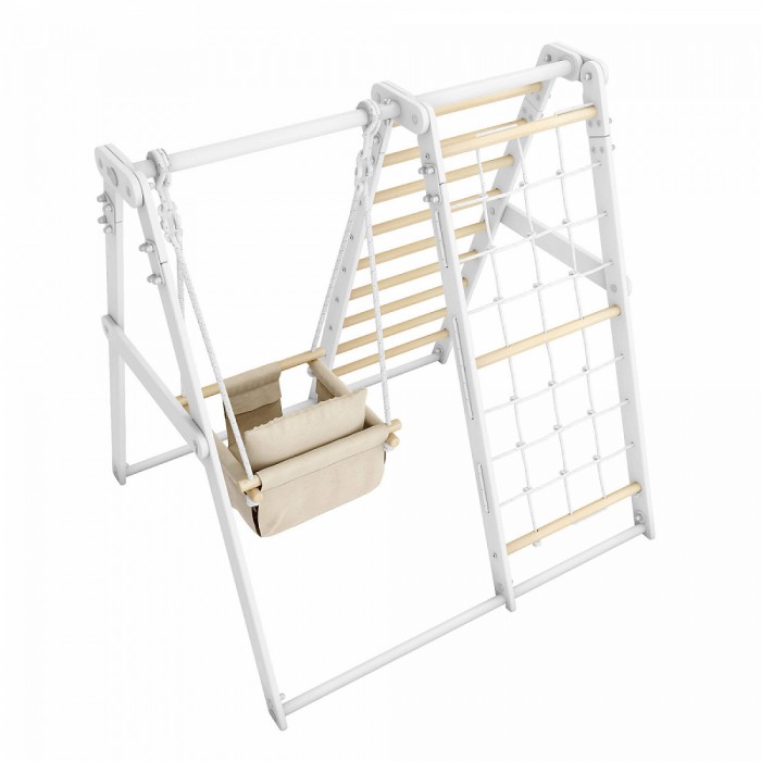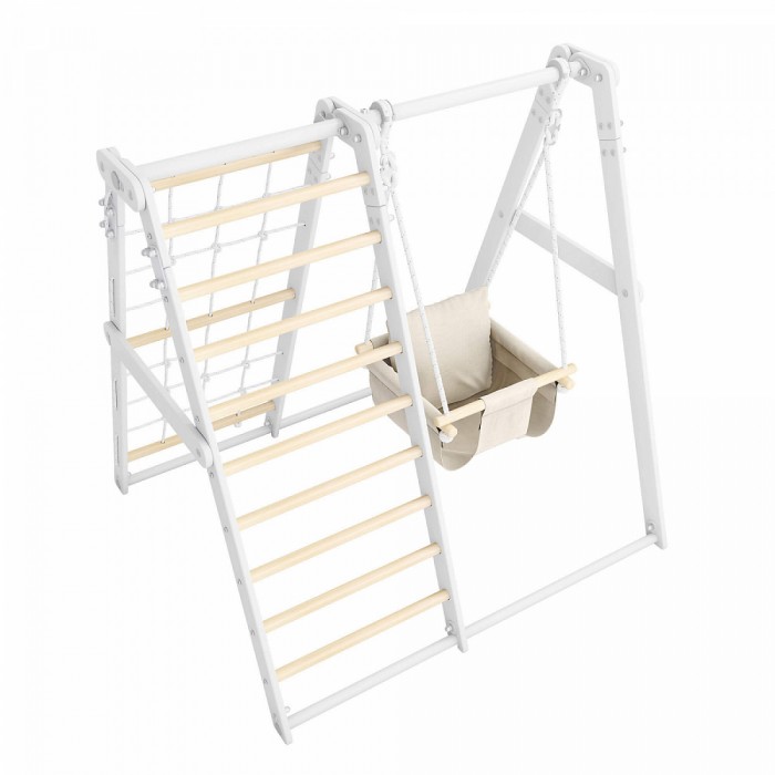 Многофункциональный и универсальный, он станет настоящим спортивным уголком: в его состав входит гимнастическая лестница, сетка-лаз и тканевые качели с перекладиной. Занимаясь на нем, малыш укрепляет силу, выносливость, мелкую моторику, вестибулярный аппарат, учится управлять своим телом, а также получает положительные эмоции.Он поможет привить мягко и через игру любовь к спорту с самого раннего возраста, а также поможет родителю разнообразить досуг малыша.