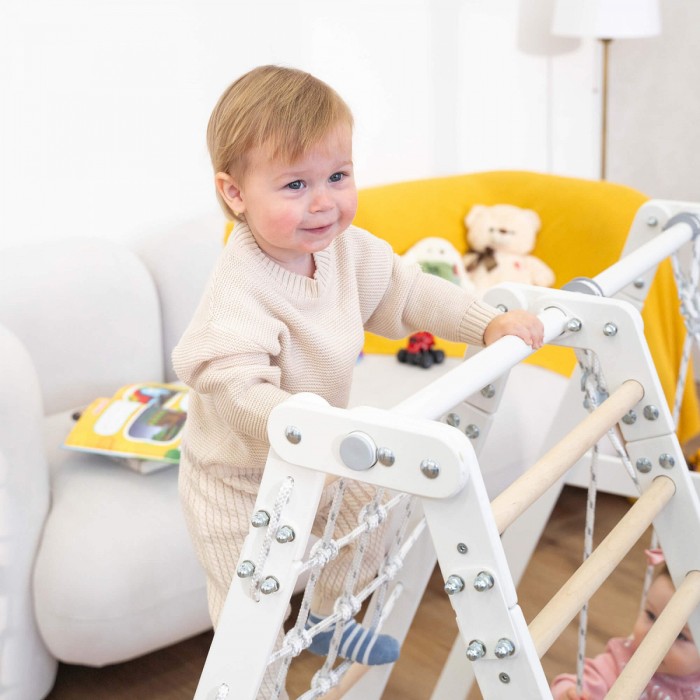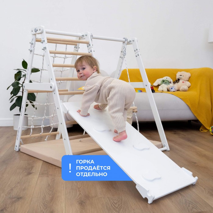 Для защиты от случайных падений не забудьте купить мягкий напольный мат 5.001.06-01, а для большего разнообразия игр и занятий - двустороннюю горку-скалодром 03.20.02.