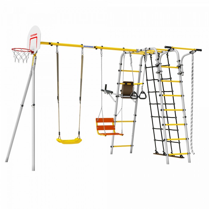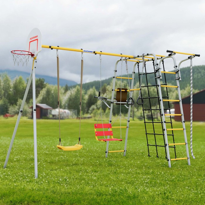 Все элементы комплекта выполнены из качественных материалов. Оборудованию не страшны неблагоприятные погодные условия. Изделие отлично переносит изнуряющее солнце, проливной дождь и ветер. Маленькие пользователи и их родители останутся довольны разнообразием лестниц, качеством качелей и надежностью брусьев. Оборудованием ROMANA Акробат-2 NEW PRO удобно пользоваться. Оно рассчитано на длительный срок эксплуатации.