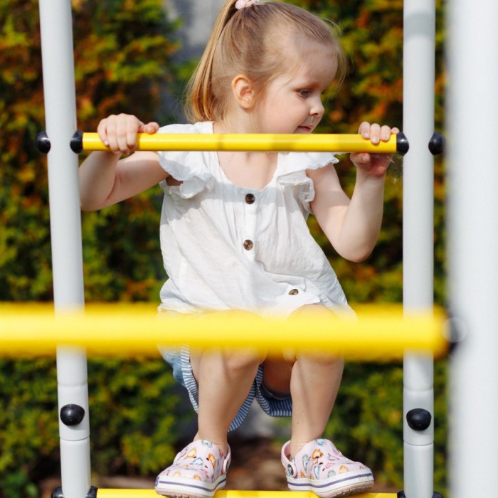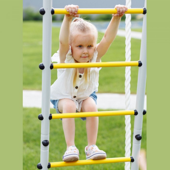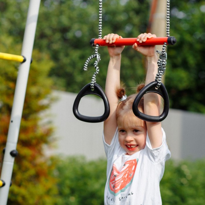 Преимуществом оборудования является то, что им могут пользоваться одновременно двое или даже трое малышей. В комплекте предлагаются цепные качели, качели пластиковые, удобная сетка лаза и брусья со спинкой и кольцами.