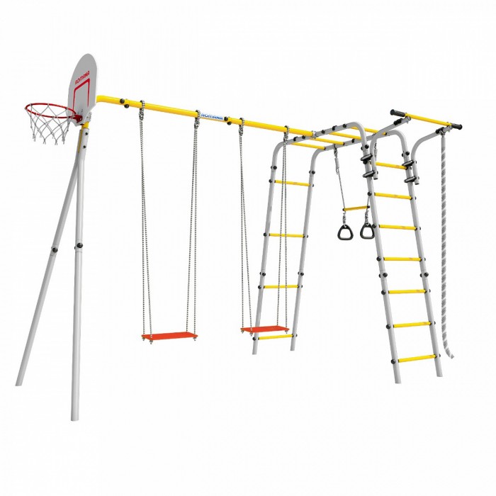 Рукоход, турник, канат для лазания и кольца с перекладиной, а также щит для игры в баскетбол — мы учли все любимые занятия маленьких непосед. Турник можно перемещать по вертикали, он закрепляется хомутами на любой высоте лестницы рукохода. Все оптимизируется под желание владельца. Навеска устойчива к атмосферному воздействию и в летнее время ее можно не заносить в дом после игр. В комплексе предусмотрены сразу двое качелей — дети не будут спорить за право покататься первым и могут веселиться вместе.