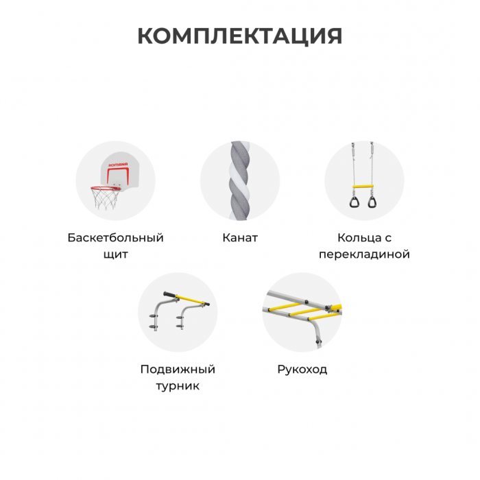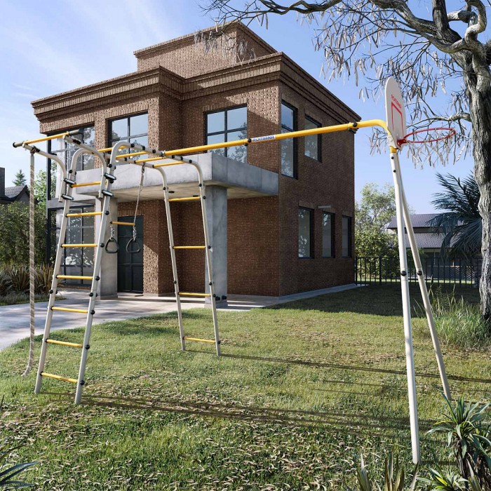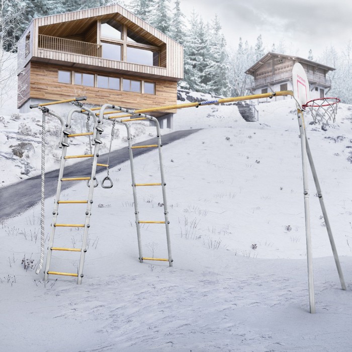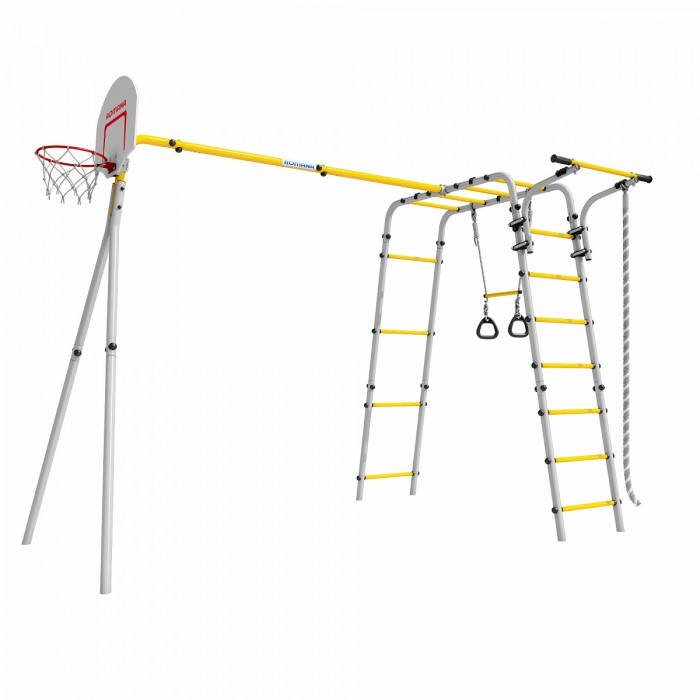 Рукоход, турник, канат для лазания и кольца с перекладиной, а также щит для игры в баскетбол — мы учли все любимые занятия маленьких непосед. Турник можно перемещать по вертикали, он закрепляется хомутами на любой высоте лестницы рукохода. Все оптимизируется под желание владельца. Навеска устойчива к атмосферному воздействию и в летнее время ее можно не заносить в дом после игр. В комплексе предусмотрены сразу двое качелей — дети не будут спорить за право покататься первым и могут веселиться вместе.