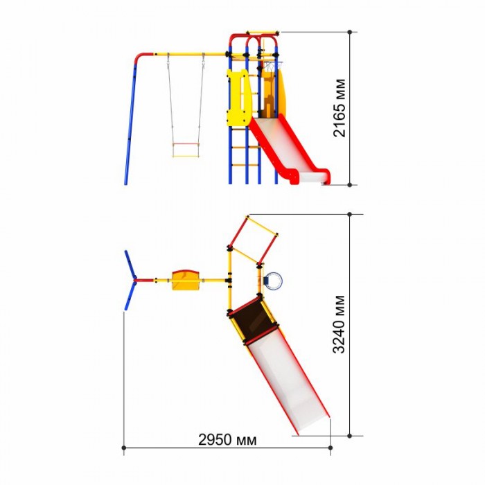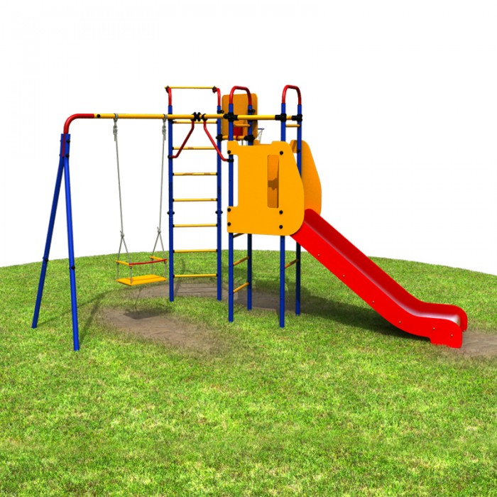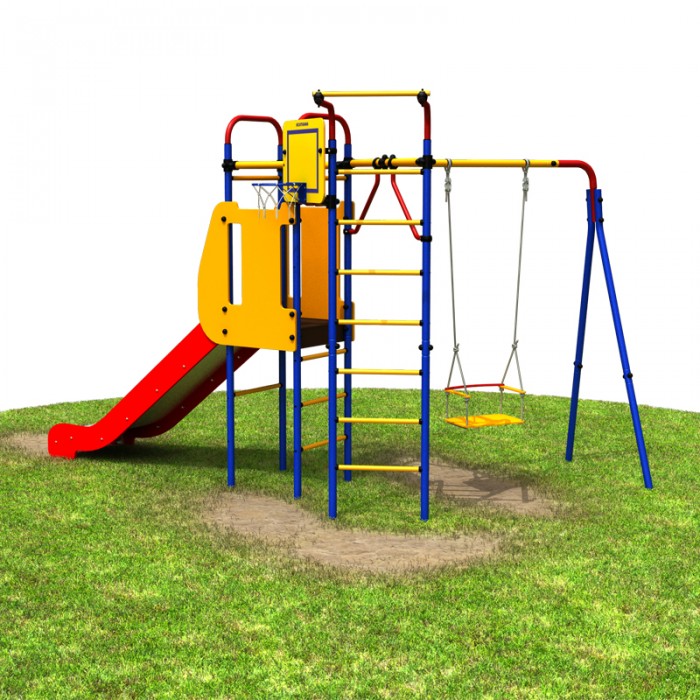 Дачный комплекс подходит для дачных участков и для городских детских площадок. В комплекте: лестница гимнастическая, турник неподвижный, щит баскетбольный, качели со спинкой, горка.