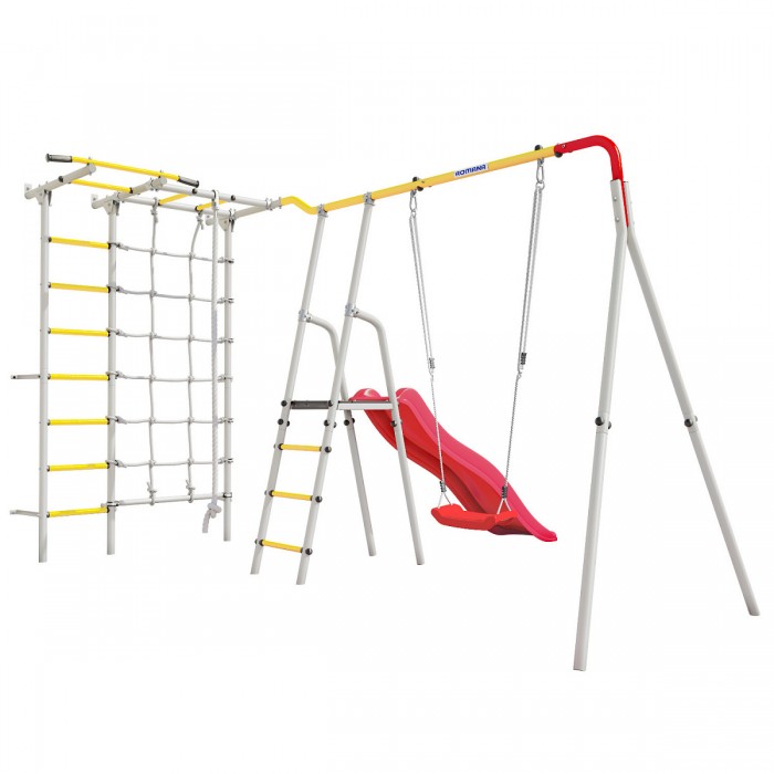 Разнообразие активного досуга обеспечивается множеством спортивных элементов. Тренажер включает в себя игровые объекты для разных возрастных групп, поэтому любой ребенок сможет найти развлечение по душе. Комплекс включает в себя шведскую стенку, рукоход, турник, сетку лаза, горку и качели на выбор.