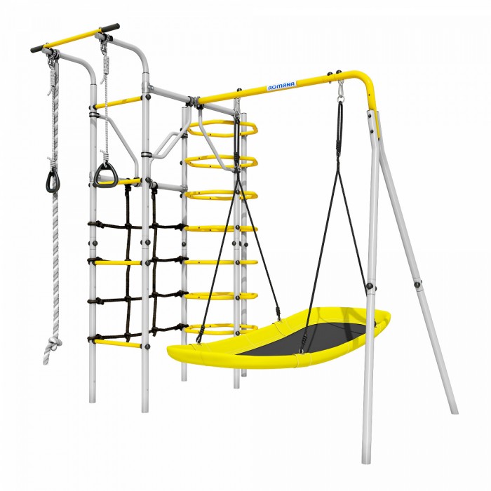Комплект включает в себя множество игровых элементов для детей разных возрастных групп (от трех лет и старше): кольцевой лаз, турник, сетка лаза, канат, кольца, и качели на выбор.