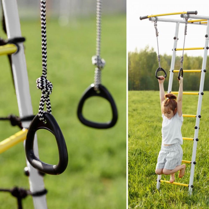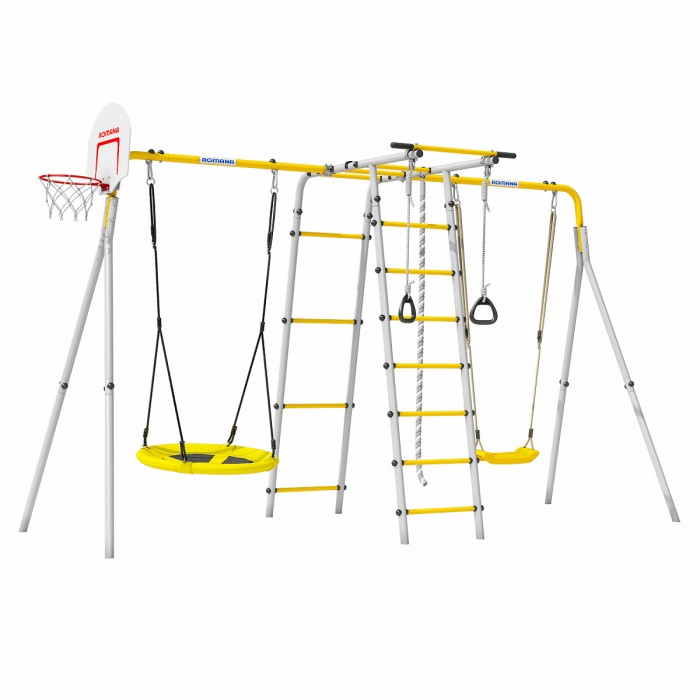 Любители качелей смогут покататься на аттракционе "гнездо". Также предусмотрены кольца, баскетбольный щит и всевозможные лестницы.